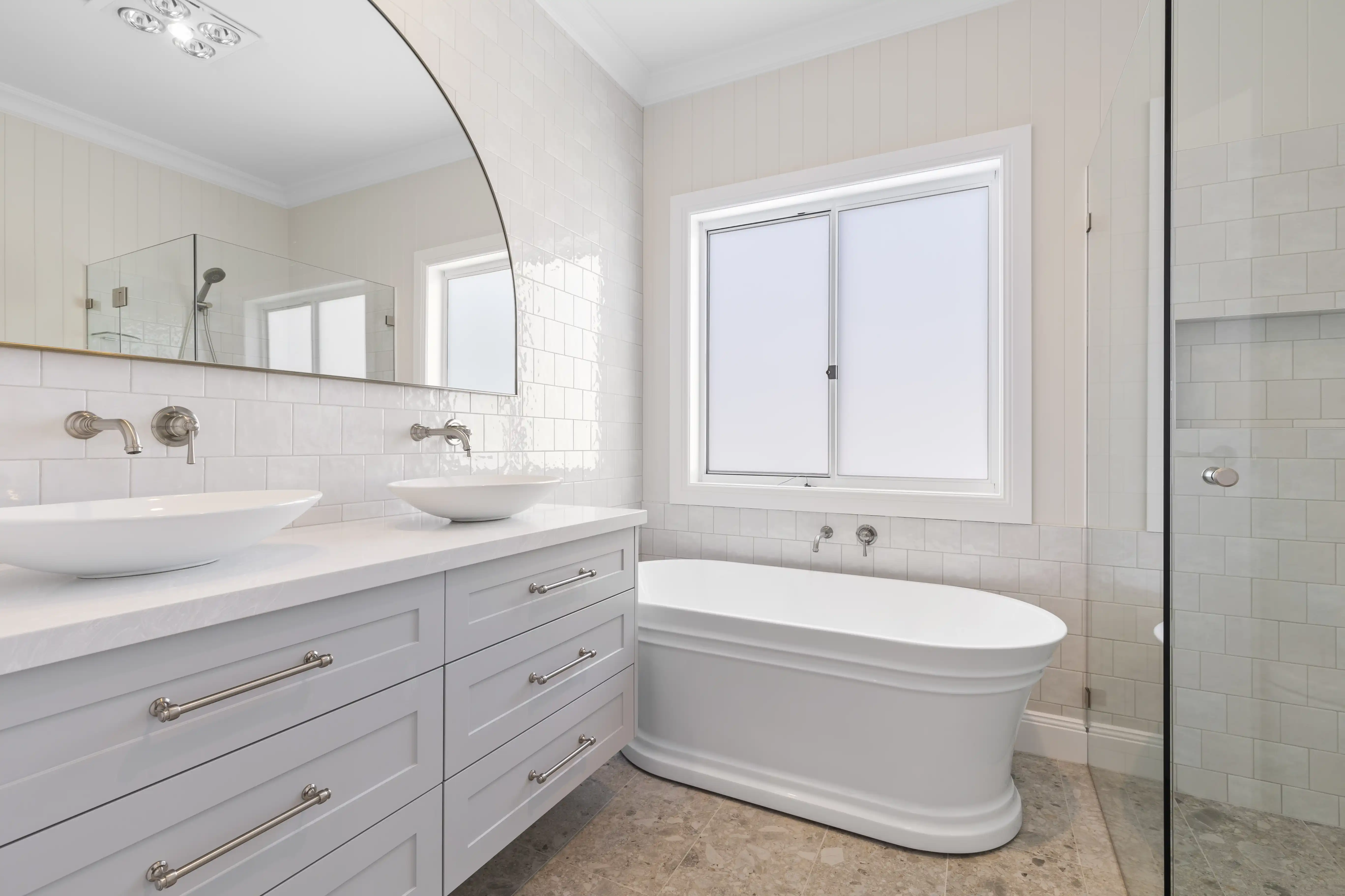 A large balcony overlooks the backyard and leafy canopies, while architectural details such as arched bathroom mirrors and brushed nickel tapware from the Phoenix Comfort Range elevate the home’s refined coastal character.