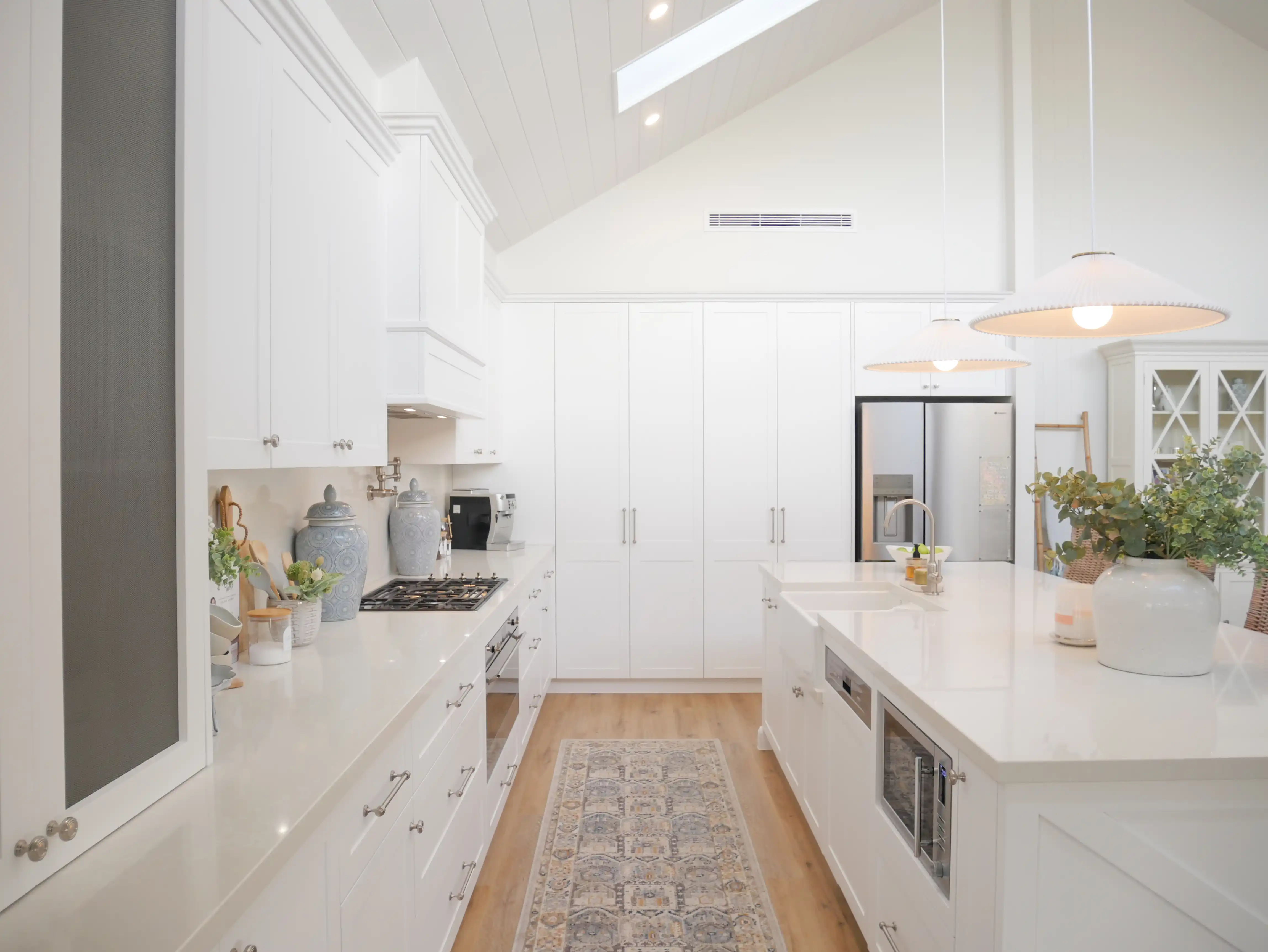 Inspired by classic Hamptons homes and heritage bungalows, the vision was to create a home that feels calm, elegant and enduring. High ceilings, abundant natural light and architectural detailing such as v-groove panelling, shaker cabinetry and traditional trims were layered with a warm neutral palette to achieve a refined yet welcoming atmosphere. The result is a family home that feels elevated, cohesive and deeply personal.